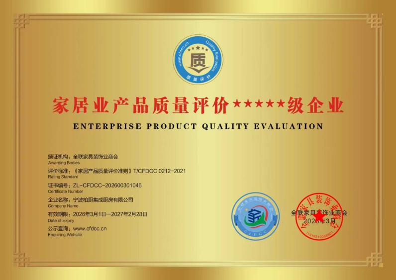 全国工商联家具装饰业商会是国内家居装饰领域极具权威性与影响力的行业组织。本次评价以严格标准、客观公正为原则,根据《家居企业信用等级评价准则》T/CFDCC 0213-2021、《家居产品质量评价准则》T/CFDCC 0212-2021、《家居企业服务能力等级评价准则》T/CFDCC 0215-2023三项标准开展,从企业信用、产品质量、服务能力等多维度综合评估,是衡量家居企业综合竞争力与市场认可度的重要标尺。柏厨公司同时拿下三项标准5A/5星等级认证,既是权威机构对企业综合实力的高度认可,也是对其长期坚守品质与服务的充分肯定。